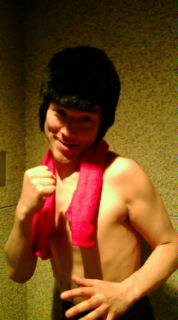 楽屋の片隅に小馬場を発見、猪木の格好をしている。