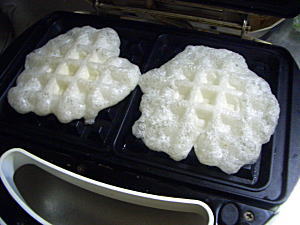 「餅のワッフル」=「モッフル」だそうです。 ネッ友さんのブログで見つけて気になったのでWEB検索してみると数件ヒットしました。 作り方はいたって簡単、ワッフルメーカーでお餅を焼くだけ・・・。 我が家に眠っていたワッフルメーカーとお正月の残りの丸餅で早速作ってみました。 食感が不思議な感じ。 焼餅でも揚げ餅でもなくて、外側はサクサク、中央付近はちょっとトロリとしています。 とりあえずポン酢で試食したけど、餡や黄な粉、砂糖醤油でも美味しくいただけそうです。 案外チョコレートとも相性いいかも・・・?! (あくまでも想像上ですが) お餅を2枚にスライスして、真ん中にチーズやハムを挟んでから焼くと、軽食にもなるそうです。 これも気になるところ・・・・。 サクサクしてて食べやすかったので、ついつい食べ過ぎました。 軽い食感でも所詮は餅。カロリーも高いし、胃がずっしりしています(^^;) 食べすぎはいけませんね、ホントに。 ==ワッフルメーカー==ワッフル専用、ワッフル+ホットサンドや焼きおにぎり、たい焼きプレート付きなどいろんなのがありますね☆