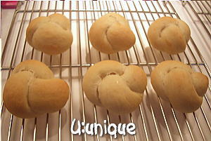 今日は朝から小雨がぱらつく中、ABCに行ってきました。まず1コマ目は「S:ごまバンズ」白ごまを混ぜ込んだリーンな生地で、3分割して丸め、表面にもゴマをまぶし、十字に切り込みを入れて焼き上げ。プックリふくらんで、ちょうどハンバーガーに良い大きさに焼きあがりました。オーブンから出したパンを見て、「お鍋に入っているしいたけ」に見えてしまって・・・。 先生や他の生徒さんに言うと、みんな大笑い!!!先生は「きっとこれからはずっとシイタケに見えてしまうと思うわ~どうしよぉ?!」なんて言ってました2コマ目は「T:ティークルート」ミルクティーとタップリのバターで捏ねた超リッチな生地。手が油分でテカテカになってしまいました1次発酵中にミルクティークリームを炊き、発酵が終われば9分割して丸めてクリームを包んで型に入れて・・・すごく工程が多くて忙しいでも、「やった!!!」という充実感は120%です。アツアツをふうふうしながらパクッと食べると、アールグレイのいい香り。甘さは控えめのクリームとほのかに紅茶の香りがするふんわりパンの相性はバッチリ1台で2000Kcalというのはいただけませんが、とってもお気に入りのパンとなりました。2時までの授業なのに、焼きあがったのは既に2時を回っていて、粗熱が取れたのは2時半過ぎ。パンが大きい上にクリームが入っているのでなかなか冷めないのおまけに土砂降りの雨で、雨宿りを兼ねて教室でノンビリしていました。本当は教室が終わってお友達と会うはずでしたが、お友達が仕事が入って次週に延期になってたのです。「不幸中の幸い」ってこういうのを言うのかな??なんて思ったりしたのでした。
