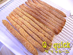 今日はパン教室に行く日♪~♪ d(⌒o⌒)b♪~♪ランラン朝一10時からの授業を受けるため、9時過ぎに家を出なくては。ちょっと早起きして支度をしていると、とんとんとんとん・・・とカワイイ足音が。ε=ε=ε=ε=ヾ(;◎_◎)ノ しまった・・・次男が起きてきた・・・。化粧をしている私を見て「・・・ママ、お出かけするの?」といぶかしげに聞いてくる。( - ゛-) ジッー仕方がないので、「ママね、お勉強に行って来るから、パパとおにいちゃんと3人でお留守番していてね」と言ってみた。一応聞き分けの良い次男、ココで駄々を捏ねてもムダだということはよーくわかっている。(! ──__──) ジトーッ!「じゃあさ~、ケーキ・・・」昨日焼いたマドレーヌがあるよと言おうと思ったら「ケーキ屋さんで買ってきてよね」と注文されました・・・(;^_^A 「わかった、買ってくるよ」と答えると、「ママ!イッテラッシャイー( ̄ー ̄)ノ▽"フリフリ 」と満面の笑みでお見送りしてくれました(='m') ウププ今日はグリッシーニとライ麦パン。どちらも工程が少ないし、味が甘くない(!)ので、私的には期待薄まずグリッシーニ。粉量少なく、コネも短め。2次発酵なしで成型後すぐオーブンへ。成型は四角く伸ばしたものに粉チーズと岩塩+けしの実+オリーブ油を振りかけて、12本に細長く切り分けます。これが意外と難しかった!というより、きっと簡単やし!とタカをくくっていたのが裏目に出た感じやっぱり上級コースだし、そう簡単に終わるわけじゃないのね・・・。それでも、2次発酵がない分、他の人より30分以上も早く焼きあがってしまいました。次の授業があるので「お先に~」って帰るわけにも行かず、ちょっと手持ち無沙汰・・・。・・・と油断していたら、次の授業が始まっていました次はライ麦パン。粉量は普通、ライ麦が入ってベタベタして捏ねにくい~発酵は順調に進み、2分割してコッペパンのような成型に。ここまではやったことあるし~♪とコチラも甘く見ていたら、ちょっと落とし穴が丸めた生地にライ麦粉をつけるのが意外と大変。形を崩さないように気をつけながら、とじ目をつかんでゴロゴロと粉のうえを転がして、包丁で切り込みを入れて・・・。オーブンに入れるとみるみるふくらんでとっても大きなパンに仕上がりました。予想外にハマった感があった今日の授業最初から×な先入観を持ってはいけないな~と深く反省した出来事でもありました。