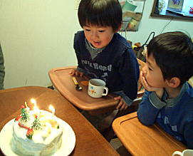 今年のクリスマスケーキはどんなのにしようかな・・・?毎年、12月に入ると色んな本を見たりネットサーフィンをしながらあれやこれやと悩みます。で、去年(確か一昨年も)はチョコ系だったし、今年はいちご&生クリームのケーキにしようと密かに決めておりました。が!!!やっぱりイチゴが高い・・・。1パック600円とか700円とかするんだもん...ρ(。 。、 ) こども達はイチゴはどうでも良くて、スポンジとクリームだけ食べるだろうし、ポチッと“赤”だけのためにそんなに払えない・・・。と思っていたら、スーパーの特売で398円で売っている!!急ぎ買いに行って(あんまり良いイチゴじゃなかったけど)ケーキに飾りました。 実は、このケーキのデコの仕上げはキラキラの飴細工だったんですが、どーしてもうまくできずに断念。うーん、長男がすごく楽しみにしてたから作ってあげたかったんだけどな。(NHKきょうの料理「クリスタルノエル」というケーキです) ま、子供達はろうそく吹き消すほうが楽しかったみたいだけど( ̄m ̄〃)ぷぷっ!