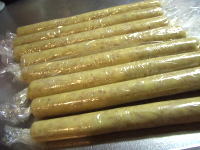 週末は幼稚園のバザー。今週の水曜にクッキー、木曜にパウンドケーキの講習会をします。(くどい?)今日はクッキー講習用の生地を仕込み、明日のお迎えの時に幼稚園に持って行きます。サクサクのクッキーが出来上がりますように(*・人・*) オ・ネ・ガ・イ♪↑仕込み終わって出番を待つ生地たち。2センチ弱の棒状にまとめてラップで包んであります。1本で約25個、8本で200個ぐらいできる予定・・・。実は、今日はなんだかいろんなことがうまく行かない日だったようで、計量は間違う、入れる順番も間違う・・・とサイアクだったのです(ーー;)その後に作ったバナナケーキは全く膨らまなかったし・・・( p_q)エ-ンああ、心配だぁ~(ノ_-;)ハア…