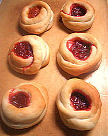 食パンを焼くつもりで生地をこねながら、発酵途中でちょっと冒険がしたくなり、1斤分の生地を8分割。直径8センチ強に丸く伸ばしてから、直径7センチ程度の丸い型で抜き、真ん中の部分を底に、周りの輪っか状の生地を8の字にねじって底の上においてカップ型に成型。中央にイチゴジャムを乗せて焼いてみました。ジャムを包み込む成型とはちょっと見栄えが異なっててかわいいかもジャムではなく、ツナマヨやコーンマヨを入れれば調理パンになるし、チョコやクリームを入れても良さそうです。ちなみに、写真左上のパンはジャムではなくピザソースを入れて焼きました。食べる時にピザ用チーズを振りかけてトーストする予定です(^_^)
