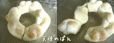 『みかさんの手づくりパンのある楽しい食卓』から「天使のぱん」を焼きました。みかさんのサイト「ぱん工房『くーぷ』のひとりごと」で、「天使のぱん」の解説が始まって、私も焼きたい!!!となったわけです。 見た目がまずかわいい! エンゼル型は持ってる!! シンプルなぱんだから、きっとパパも食べるだろう!!!作り方は本のとおりなので割愛しますが、サイトでの丁寧な解説がすごーく重宝しました。本には書いてないちょっとしたコツがいろいろあるんだもの。真っ白フワフワ(見た目も中身も)が出来上がりました~。焼きたてをまず写真に撮って、その後我慢できずにちぎってパクッと食べたら美味しいの♪♪♪キャー ヾ(≧∇≦*)〃ヾ(*≧∇≦)〃 キャー子供達はチョコクリームを挟んで食べてました。シンプルなぱんは、食べる人が自由にアレンジできるのがいいね。サイトで紹介されていた「ベビーエンジェル」(天使のぱんの1/3)あまりにかわいいので、まず12センチの型を買いに走りました。(実際は“走った”のではなくて、ネット注文だけど(^^;)エンゼルケーキ型 アルミ12cm↑「厨房の家」さん、本日中は送料無料だよ!!!!レシピ:みかさんの手づくりパンのある楽しい食卓「天使のぱん」