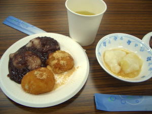 駅前の福祉センターでもちつきがありました。軒先でぺったんぺったんお餅つき。そして、つきたてのお餅が食べ放題~!!「外におったら寒いから、先にお餅食べてからにしー」と、ボランティアのおじさんに案内されて室内に入り席に着くと、おばあさんがお餅とお茶を持ってきてくれました。「いっただきまーす♪」あんこ餅、きなこ餅、大根おろし餅の3種類。甘ーいのを食べた後に大根おろしでサッパリ♪気が利くねぇ~(*´∇`*)「いっただきまーす♪」めったにお餅を食べない次男がきなこ餅をパクパク食べていました。 やっぱりつきたてはオイシイね~。食べ放題と言ってもそんなにたくさん食べられる訳もなく・・・最初に出された分で満腹っす。周りの学生さん(男の子)なんて5回以上おかわりしていたわ(^ー^* )食べ終わってから外へ出てお餅つきの見学。臼のなかを覗いた次男は「ごはん!ごはん入ってる~!!」とすごく驚いていました。お餅のはずなのになぜご飯??と思っているうちに、ぺったんぺったん・・・あっという間に見たことのあるお餅に大変身!「ボクもやってみるか?」と声をかけていただいて、子供用の杵を持って初ぺったん。杵が重くてあまり持ち上がらなかったけど、「楽しかった~!!」と、とても興奮していました。美味しいお餅♪♪♪おうちでお餅つき♪♪♪