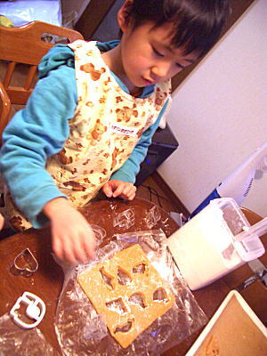 今朝、長男が「クッキー作りたいから、用意しといて」って言い残して幼稚園に行きました。昨日のパンづくりのお手伝いで、家でクッキングする楽しさに気が付いたのかな?今まであまり興味がなかったので、「やりたい」と言ってくれることが嬉しかったりして(*^-^)ニコというわけで、午前中にクッキー生地の仕込みです。キャラメルクリームを入れるレシピだったので、まずキャラメルを作りました。冷めたら、生地に混ぜます。生地は強力粉と薄力粉が半々で、バターは発酵バターを使ってみました。まとめた生地をポリ袋に入れ、5ミリ厚に伸ばしてから冷蔵庫へ。こうしておけば、ポリ袋の縁を切り取るだけですぐに作業に取り掛かれるのよ。子供って待つのがキライだから、「さあどうぞ!」というところまで用意しておいてあげるとスムーズにコトが運びます。冷蔵庫で寝かしている間に、幼稚園のお迎えに行きました。もしかして朝言った事忘れてるかも?と思ってたんですが、「家に帰ったらクッキー作る」としっかり覚えていました。(用意しておいてよかったぁ~)帰宅後、早速型抜きタイム!家にあるクッキー型を総動員。小さいの、複雑な形のもの、スタンプになっているのや素材も色々・・・。クッキー型に粉を付けてポンと型抜き・・・がうまくできないんですよね。型からはずす時にぐちゃーっとなったり、力加減が下手でキレイに形にならなかったり。長男はかなりイライラしつつも、徐々にコツをつかんできたようで、「プラスチックよりもステンレスのほうがキレイにできる」ことをなーんとなく感じ取ったみたいでした。一方、短気&まだ3歳の次男。当然、うまくできません。なので、型を生地の上に置いてあげて、「上からギュッと押す」作業だけをしてもらいました。「全部やるー!」と怒るかと思ったけど、案外これだけでも楽しかったようで、「次はくまさん♪その次は・・・」とドンドン型抜きをしていました。オーブンで焼くこと15分。焼きたてのクッキーはとってもいい香りがして、子供たちはおめめがキラキラ☆彡「ね、食べてもいい?」「どれから食べようか??」ととーっても嬉しそうにパクリ。まだ温かいクッキー、すんごく美味しかったみたい(*^o^*)自分達で作ったのだから尚更ですよね~。あまりの勢いで食べ進むので「・・・パパにも残しておいてね」とお願いしました。次は何をやりたい!って言い出すのかな?お外で遊ぶのもいいけど、お部屋の中で楽しい遊び(?)をするのもいいね☆彡レシピ:かよさんのおうちカフェ12ケ月のお菓子レシピ キャラメルクッキー==クッキー型いろいろ==