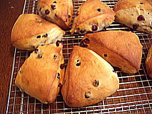 昨年の体験イベントのレシピで「ベリーヨーグルトブレッド」を焼きました。が、若干材料が揃わなかったので、ちょっとだけアレンジになってしまいました。生地は水分が牛乳+ヨーグルト、粉は強力粉+ライ麦粉、クランベリー・ブルーベリーを混ぜ込みしてます。成型は、15センチほどの円形に手で伸ばして、放射状に6等分。三角形のカワイイパンに仕上がりました。クランベリーのサクサクした食感と酸味、ブルーベリーの甘味が効いていて美味しい!こねているとき、少しべチャッとしていた分、フワフワ食感に仕上がっていました。ベリー類があまり好きではない次男が「ぶどうのパン、美味しいね」と2つ食べました☆