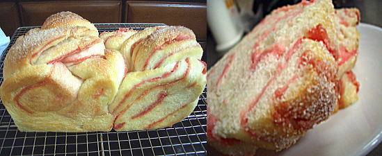 ママパンさんで買った「練乳いちごシート」早く使わないと賞味期限が迫ってきた~!!!!どんな風な成型にするか?生地はどのレシピにしよう?いつもながら考えている時は楽しいものですね~(*^-^)生地は、昨日と同じ「パン・オ・レ」の生地で。2分割して、「練乳いちごシート」を挟んでから四角く伸ばし、くるくるとロールケーキ状に巻き巻き。端を切り離さないようにスケッパーで半分に切り、ねじります。ねじったものを裏返しにして、両端を折りたたんでくっつけたら、食パン型に入れます。焼成直前にグラニュー糖を振りかけて、200度で30分。焼けたのはこんなの♪ピンクの層がハッキリ見えるように、あえて練乳いちごシートを織り込む回数を少なくしたのですが、もうちょっと折り込んだほうがよかったかなぁ。イメージにとても近い成型ができたのだけど、食感という点では少々マイナスでした。次男は「いちごのパン、美味しいね~!!」と大絶賛してくれました。彼、甘いもの(和菓子以外)は甘けりゃ何でもいいんだよね・・・。