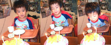 昨日で次男は無事3歳になりました。お兄ちゃんの幼稚園入園に振り回され、あっという間に過ぎた2才代。3歳はどんな1年になるんだろうね?!バースデイケーキは結局手作りになりました。朝から雨で買い物に出られなかったんだもの・・・。スポンジはアトリエ・タケハラさんのレシピで。初めて作ったのでうまくできるかどうかドキドキしていたけど、すごくきめが細かくてフワフワのスポンジが焼けました。クリームは、生クリームにマスカルポーネチーズを混ぜてホイップ。ちょっとコクのあるクリームになりました。トッピングは、生のパイン・キウイ・グレープフルーツ(ルビー)をナパージュでコーティング。チョットお洒落に並べてみました。(でも切り分けるのが大変でした・・・)チョコレートのプレートがあればよかったけど用意できなかったので、色画用紙にメッセージを書いたものを爪楊枝に貼り付けてみました。