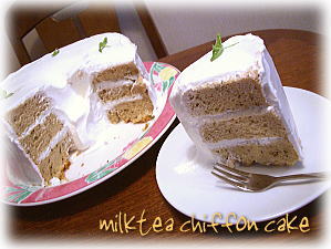 土曜日に食べたロンシャンの「生クリームで紅茶を抽出!ロイヤルミルクティー・シフォンケーキ」が美味しかったので、ソレに近いものを・・・と作ってみました。材料は下記のとおり~☆卵黄 2個砂糖 30gミルクティー(牛乳でアールグレイを煮出したもの)80gティーリキュール 小さじ1薄力粉 100gベーキングパウダー 小さじ1/2〈メレンゲ>卵白 4個砂糖 30g生クリーム(今日はあいにく植物性)200ml砂糖 大さじ2ティーリキュール 大さじ1普通にシフォンを焼き、3段にスライスしてクリームを挿み、中央の穴部分にたっぷりとクリームを入れました。ロンシャンのシフォンは、クッキーが土台になっているのですが、クッキーは割愛しました(^^;)クリームが余っていたので、周りにもナッペしてみましたが・・・ナッペするほどはなかったのよね、スポンジがところどころ見え隠れ(-。-;)子供達には大ウケ♪♪♪パパも「買ったのには負けるけど、十分おいしいで~」と褒めてくれました。確かに、紅茶の香りが負けてるし、クリームも負けてた~orzま、ワタクシ、シロウトですし、こんなもんでしょ?!子供達がガツガツ食べる分には・・・ネ。