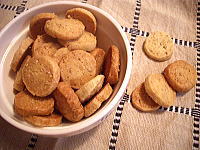 バザーの試作をかねて「ゴマクッキー」を焼きました。材料は・・・薄力粉200g、無塩マーガリン130g、砂糖75g、卵1個、塩2g、白ゴマ40gフープロに粉類を入れてガーッと混ぜ、1センチ角に切ったマーガリンと卵を入れてまとまるまでガガガと回します。まとまったら直径2センチの棒状にまとめて冷凍庫へ。7ミリ程度の厚みに切り分け、150度のオーブンで20分焼き、天板に乗せたまま冷まします。サクサクとした食感がくせになるクッキーの完成!ワーイ♪☆彡(ノ゜▽゜)ノ☆彡ヘ(゜▽゜ヘ)☆彡(ノ゜▽゜)ノ☆彡ワーイ♪白ゴマの量をもう少し増やしたほうが私好みなんですが、ゴマ嫌いなヒトのことも考えると40gは妥当ラインかも?!先日、黒ゴマ75gで作ったら、御影石のような見た目+ゴマの香り・味がきつかったようで、子供ウケが悪かったのです。大人には評判良かったんだけど・・・この分量で100個ほどできたのですが、バザーでは、プレーン・ココア・ごまの3種類で1000枚近く焼かねばなりません。オーブンで焼く時は、8人ですが、生地の仕込みは2人でするのよね。ほほほ。気が遠くなるわ~。