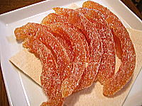 今までずーっと捨ててました、グレープフルーツの皮・・・。オレンジの皮は、オレンジピールにしたり、ペーストにしたりすることはあったけど、グレープフルーツの皮って苦味がキツイから無理だと思ってたんです。でも、楽天の mebhiさん が「パメラ」というお菓子を作られていて、あまりに美味しそうなので作ってみました。グレープフルーツの皮を何度も茹でこぼして苦味を抜いてから、グラニュー糖で煮、最後にグラニュー糖をまぶして出来上がり。文字で書くとこれだけだけど、かなり手間のかかるお菓子です。キレイなルビー色に出来上がったパメラ。宝石みたいです。出来上がったパメラに、チョコレートを上掛けしてみたらこれまた美味しいの。次男があっという間に食べてしまって画像がないのですが、オランジェット風のしゃれたお菓子になりました。砂糖の量を考えると毎回は無理ですが、グレープフルーツの皮が捨てられなくなりそうです(^▽^;)==オランジェットってこんなお菓子==