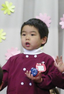 だいぶ遅くなってしまいましたが発表会はこんな感じ・・・ おもちゃのちゃちゃちゃのペープサートでカスタネット担当してました。1番だったので緊張してたみたい。一生懸命“ちゃっ、ちゃっ”ってうなずいてました。ベイビーロックンロールでは咳をごんごんしながらも張り切って踊ってました。あ~ボケボケ・・・ 毎日お片付けしなさ~い!!と怒鳴る毎日。慌てて保育園に送り帰って見ると部屋の片隅にこんな風に片付けてありました。 クリスマスツリーを飾ってあった横にひっそりと・・・文句が言えなくなってしまいました。子供なりに考えたらしいです・・今一生懸命つたい歩きしてるアカゴちゃんですがおとなしいなあ・・・と思う時は何か口に含んでる事が多く先日はのりを美味しく食べたらしく満面の笑み おっぱい大好きでご飯食べてくれないんだけどちょっとづつ大きくなって来てるのでママは嬉しいです。かわいくないって言われても自分にとっちゃかわいいんだからいいんだもんね。