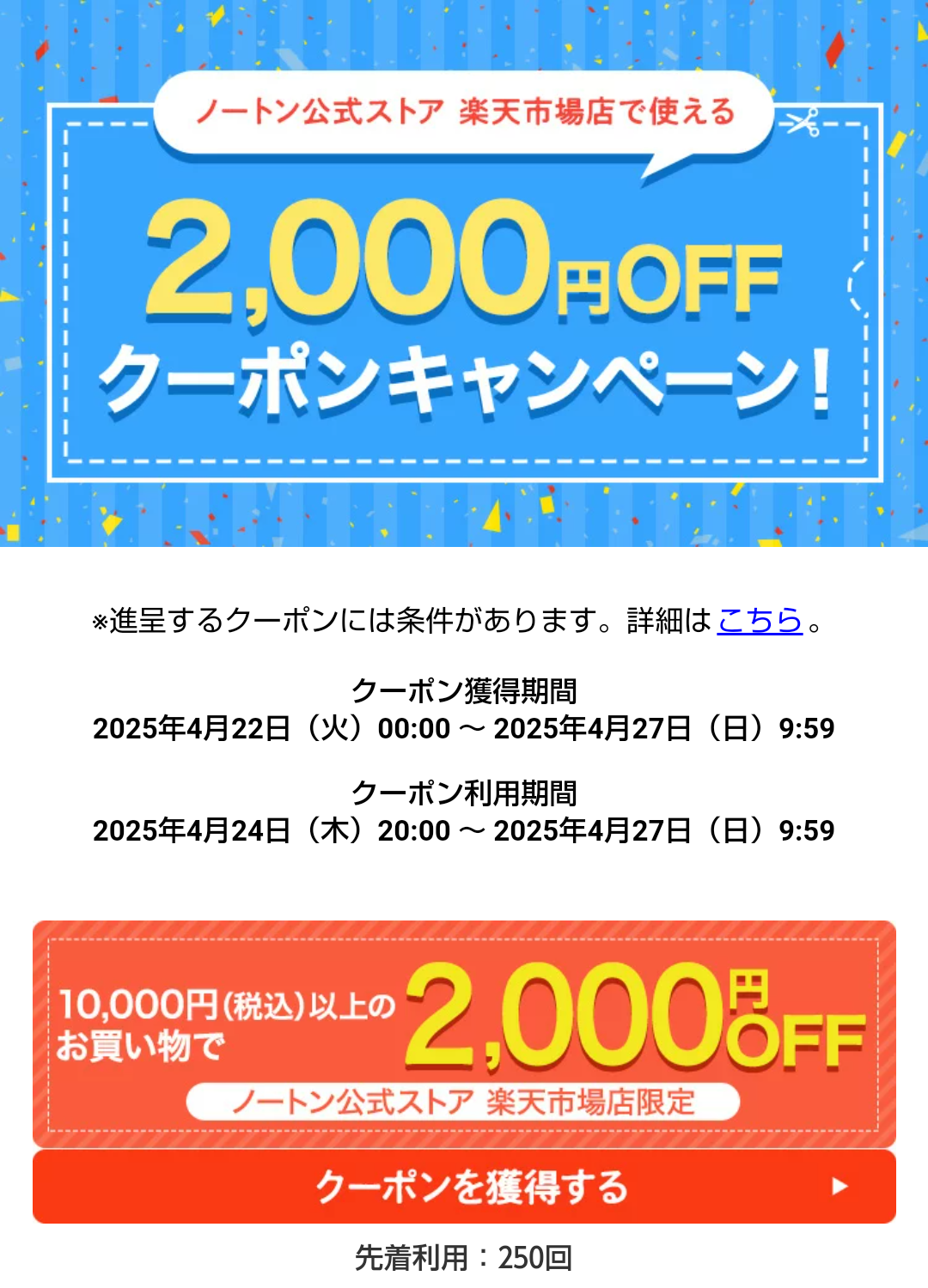 対象ショップで使える最大1,000円OFFクーポンキャンペーン! ノートン公式ストア 楽天市場店限定2,000円OFFクーポンキャンペーン!!