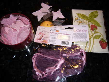 ちょっと前から、”サシェ(匂い袋)を自分の洋服ダンスに入れたいな”と思っていて、とあるお店に見に行ったのですが、見つけたサシェ1個自体が高いので、タンスの引き出し分、買うと、かなり高い・・・なので、自分で作ることに サシェの材料写真の左側から蝶ちょの形をした布達は、先日、カナダへ行った時にクラフト屋さんで購入。小さな布袋も、カナダで。そして、ストロベリーのサシェ用芳香剤は、日本のとあるお店で購入。 サシェの中身は小さな布袋の中に蝶ちょの布達とストロベリーの芳香剤を一緒に入れますそして、布袋のリボンを縛って、結べば、サシェの完成 出来上がったサシェです一番左側の濃いピンクのサシェは、母上用にあとのは、自分の洋服ダンスのそれぞれの引き出しに入れますストロベリーの香りが、ふんわりして、とても良い香りです