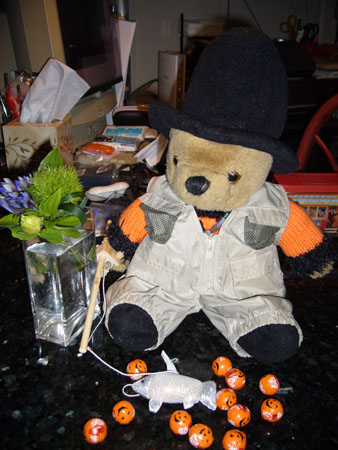 最近、でも、Halloweenをするんですねっ今朝、美容院へ行ったら、美容師さん全員が、Halloweenコスチュームを着ていて、可愛かったですそして、抹茶んちの息子の一人(いやっ、一匹)ラセル君は、カナダに居る時から既にHalloweenコスチュームを着て、Halloweenをやる気満々です今年は、釣り人ですラセル君が着ているオレンジのセーターの前の部分には、ちゃーんとJack-'o-lanternの顔が描かれています。ジャケットを脱ぐと、わかるんですけどね。(笑)上の写真では、ラセル君、釣竿に魚をエサにして、Jack-'o-lanternのチョコボールを釣ろうとしているみたいです2,3日前までは、チョコボールじゃなくて、J-bearやホワイティ(我が家の長男ゴマちゃん)を釣ろうとしていました・・・(爆)抹茶お気に入りミニブーケ 何の植物だかわかりませんが、この緑色のフサフサが気に入って、このミニブーケを購入。とても単純な購入動機です・・・バンクーバーに居るお友達の話によると、あちらのHalloweenは、のようで・・・大体、バンクーバーは、Halloween時期は、雨が多いのです。あなたのHalloweenは、どうでしたかHappy Halloween