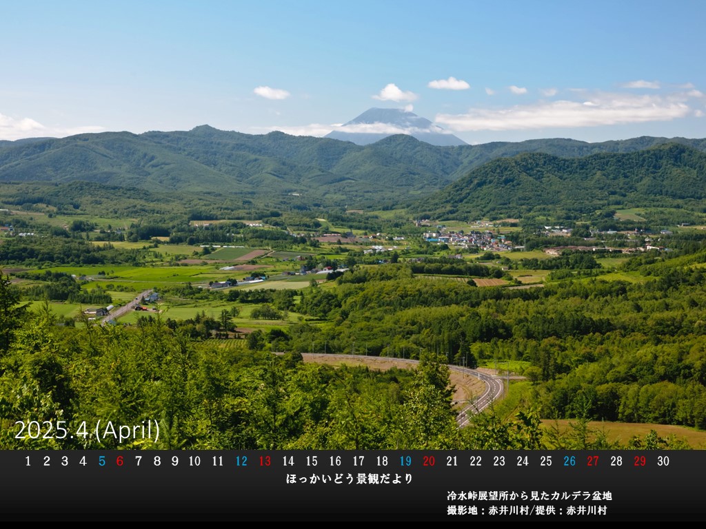 北海道建設部まちづくり局都市計画課です。都市計画課では、北海道の美しい景観をPRするデスクトップ景観カレンダーを配布しています。魅力的な写真をご覧ください! 4月は、赤井川村の「冷水峠展望所から見たカルデラ盆地」です。 写真提供:赤井川村赤井川村は、その四方を山々で囲われたカルデラの里状の地形をなしていますが、村の南東部にある余市岳に源を発する余市川が西流し、この流域に沿って平坦地が帯状に形成され、耕地や宅地として利用されています。村道冷水峠線の途中にある冷水峠展望所から眺める赤井川村は、木に遮られて峠からは見えなかった赤井川村市街地が一望できます。この展望所からは、山々に囲われたカルデラ盆地や羊蹄山を一望できタイミングが合えば、まるで「雲の湖」のよう美しい雲海を眺めることができます。美しく広大な自然に恵まれている赤井川村へ是非訪れてください!皆さん、ぜひダウンロードして、デスクトップの背景にご利用ください。※下記にURLを載せておきますので、是非ホームページからご覧ください。 https://www.kita-smile.jp/hokkaido_keikan