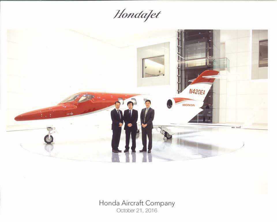 ノースカロライナ州グリーンズボロ市のホンダジェット社本社にて。竹内弘高ハーバード大学経営大学院教授(左)、藤野道格ホンダジェット社長(中央)、武田さん(右)