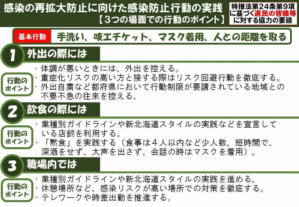 道民の皆様には、この度の道の決定内容について、ご理解、ご協力をいただくとともに、全道域で再拡大防止に向けた感染防止行動の実践を徹底いただきますよう、よろしくお願いいたします。