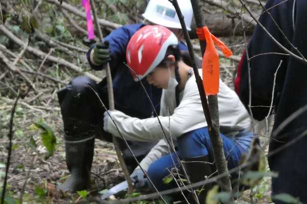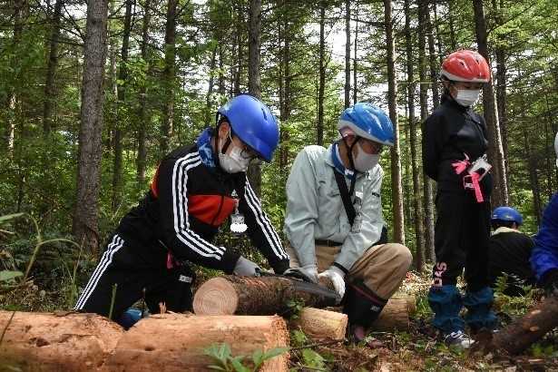 1日目の夜からは、渡島総合振興局林務課から講師を迎え、二酸化炭素を吸収する森林を守る仕事について学びました。2日目には実際に森町内の町有林に出掛け、除伐作業や伐採した木の運び出し作業などを体験しました。みんなで細かく切った木は乾燥させ、薪として利用者のみなさんに使っていただく予定です。また、木の間隔を広げ、成長を促進させる間伐作業も見学し、森の中が整備されていく様子を真剣な表情で見ていました。