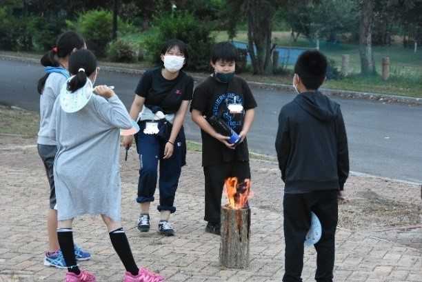 夜は再び外に出て「 ​スウェーデントーチ​ 」を楽しみました。切り込みを入れた間伐材を立てて火を付けると、美しい炎が立ち上がります。火を囲みながら、子どもたちはここまでの活動を振り返り、思い出に花を咲かせていました。​