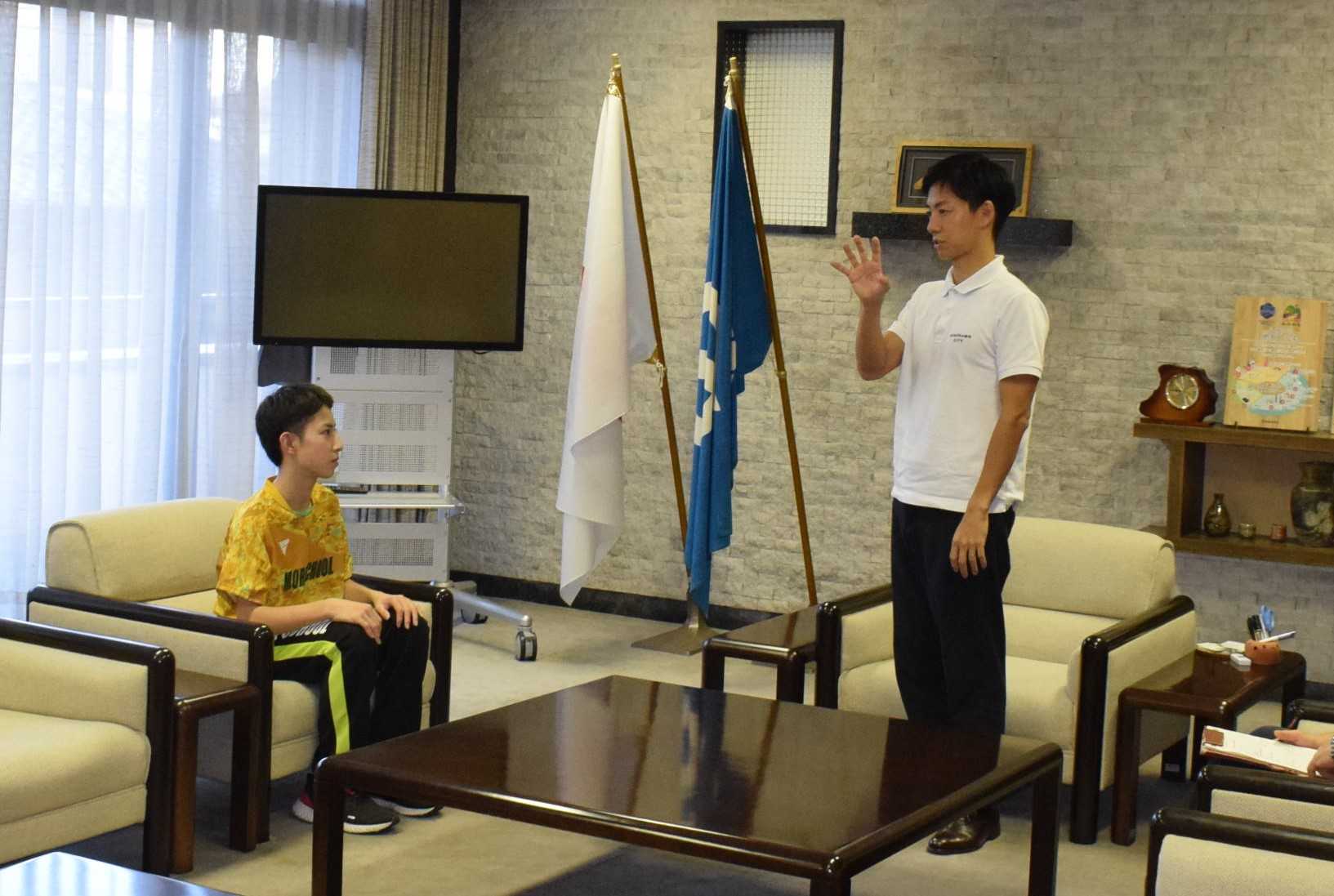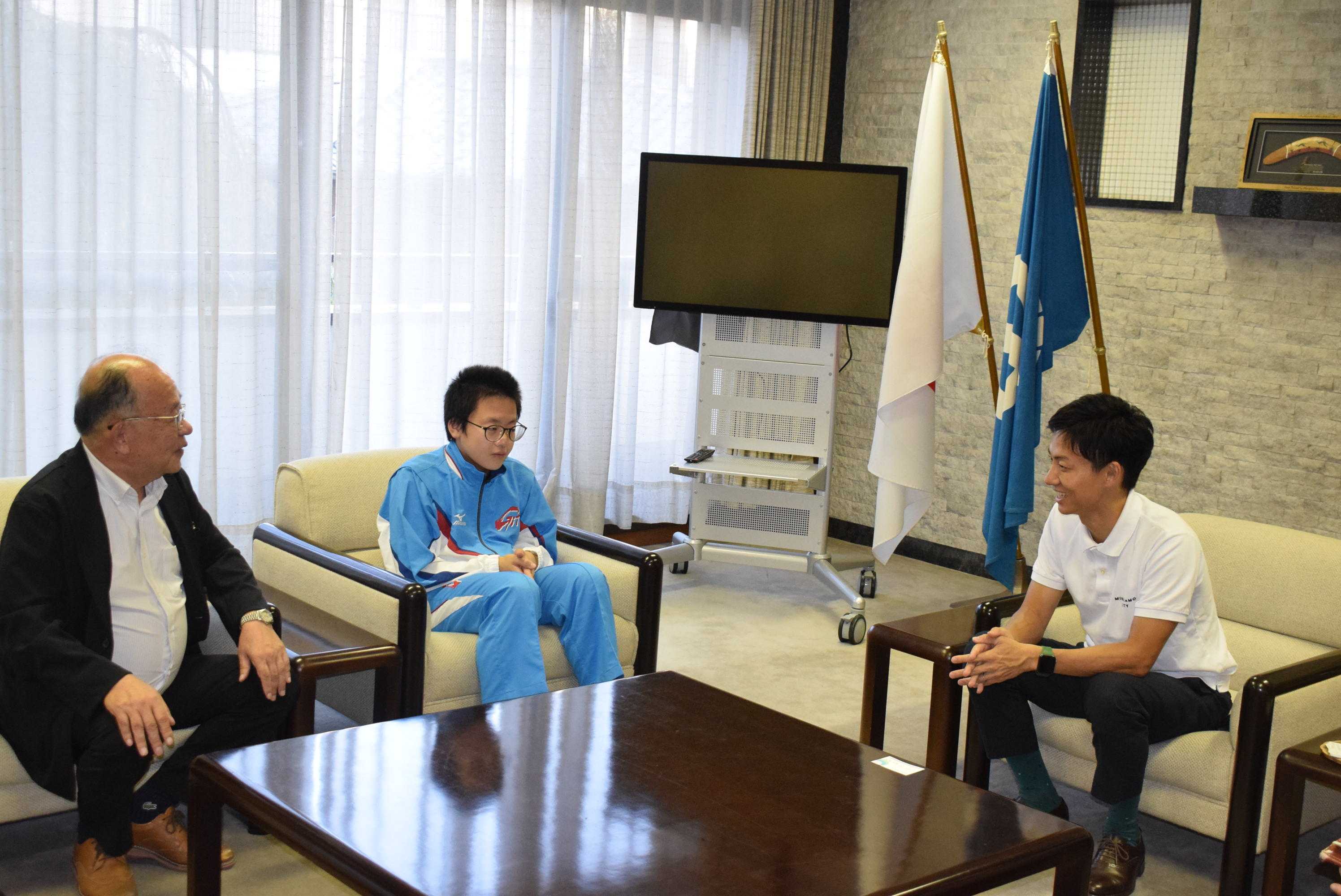 10月17日、美濃加茂市公室に、岐阜県立可茂特別支援学校2年生の甲斐田悠太(かいだゆうと)さんと、3年生の溝口良々(みぞぐちらら)さんが、全国大会に出場することを報告するために、美濃加茂市長を表敬訪問されました。お二人は、岐阜県パラスポーツ大会春大会で優秀な成績を挙げられました。甲斐田さんは、陸上競技の男子50mに出場し、7秒05という記録で優勝されました。また、立幅跳びでも、2m41という記録で優勝されました。全国大会では、4×100mリレーにも出場されます。溝口さんは、卓球競技の「少年・青年の部女子」Bリーグで優勝され、全国大会出場権を獲得されました。甲斐田さんと溝口さんは、10月25日(土)~27日(月)に、滋賀県で開催される「第24回全国障害者スポーツ大会『わたSHIGA輝く障スポ』」に出場されます。甲斐田さんは、「友進リバーサイドフィールドを作っていただき、そこで練習させていただき、ありがとうございます。全国大会での目標は、金メダルを獲得できるように挑むことです。」と、溝口さんは、「集中して頑張りたいです。」と、抱負を語られました。藤井市長は、「今、お二人から、目標と思いを聞いて、心から応援したいと思った。全国大会に出場できることは素晴らしいこと。誇りをもって欲しい。おめでとうございます。今まで、大変なこととか課題とかがあったと思う。部活や運動以外のことでも頑張っていると聞いている。一つ一つのことに一生懸命頑張っているからこそ、こういう力を付けていると言える。全国大会では、全国からライバルが集まってくる。友達をたくさん作って、素晴らしい思い出を作ってきて欲しい。それぞれの舞台で頑張ってきて欲しい。」と、激励しました。