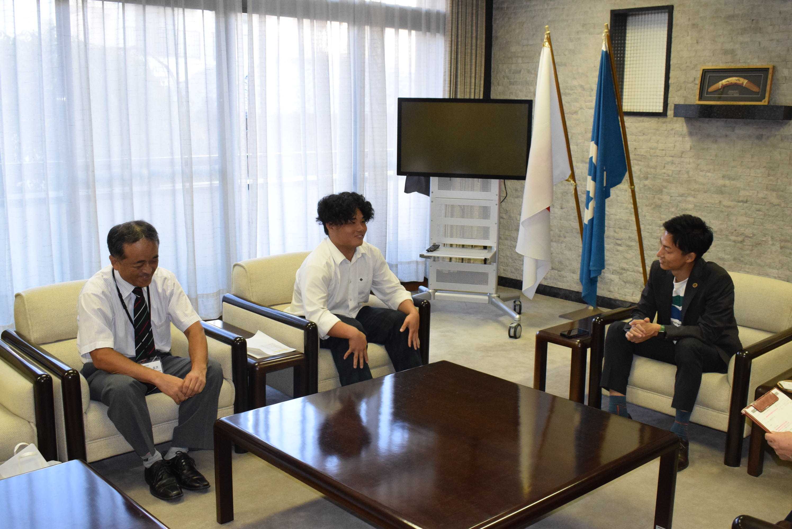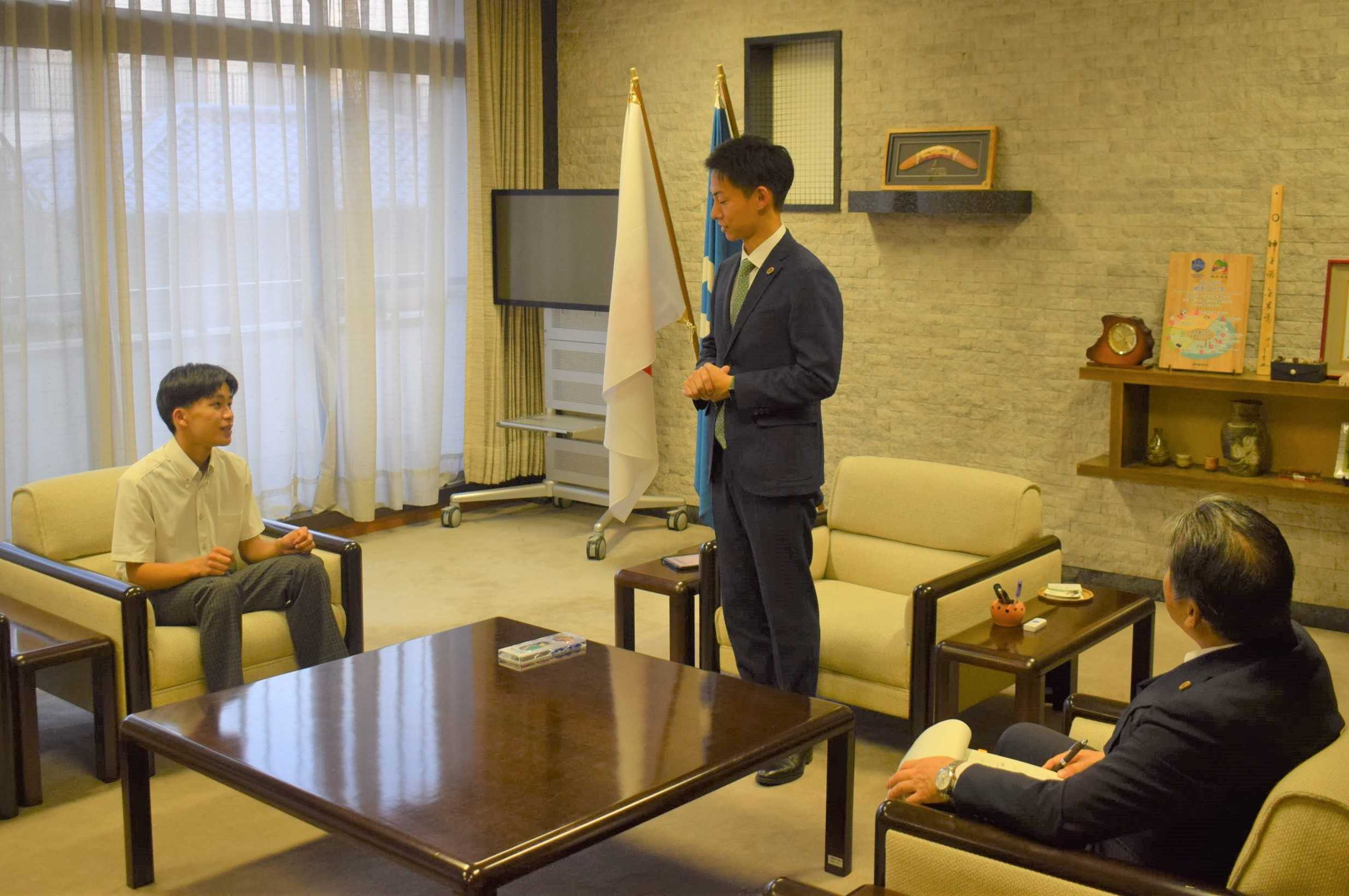 9月26日、美濃加茂市公室に、「岐阜県立加茂農林高等学校レスリング部」に所属している、3年生の紀藤紘哉(きとうひろや)さんが、レスリングの岐阜県代表選手に選ばれ、国民スポーツ大会に出場することを報告するために、美濃加茂市長を表敬訪問されました。紀藤選手は、9月29日(月)~10月2日(木)に、滋賀県栗東市の「栗東市民体育館」で開催される「第79回国民スポーツ大会レスリング競技」の「少年の部グレコローマンレスリング92㎏級」に出場されます。紀藤選手は、「数多くの全国大会に出ていて、全国大会の空気には慣れたが、今回が高校生活最後の大会になる。ライバルがいっぱいいるけれど、優勝したいと思っている。優勝できるように頑張ります。」と、抱負を語られました。藤井市長は、「何度目かの来訪になる。今回が最後と言わず、優勝トロフィーを持ってまた会いに来て欲しい。初めて来てくれた時を思い出すと、とても緊張していた。今は、にこにこと笑顔で、余裕を感じられるようになった。レスリングの経験は、これからの人生に生きてくると思う。大会では、一戦一戦を大切にして欲しい。そうすれば、おのずと結果はついてくるだろう。その結果は、順位ではなく、力を出し切って頑張ったということである。頑張ってきて欲しい。」と、激励しました。