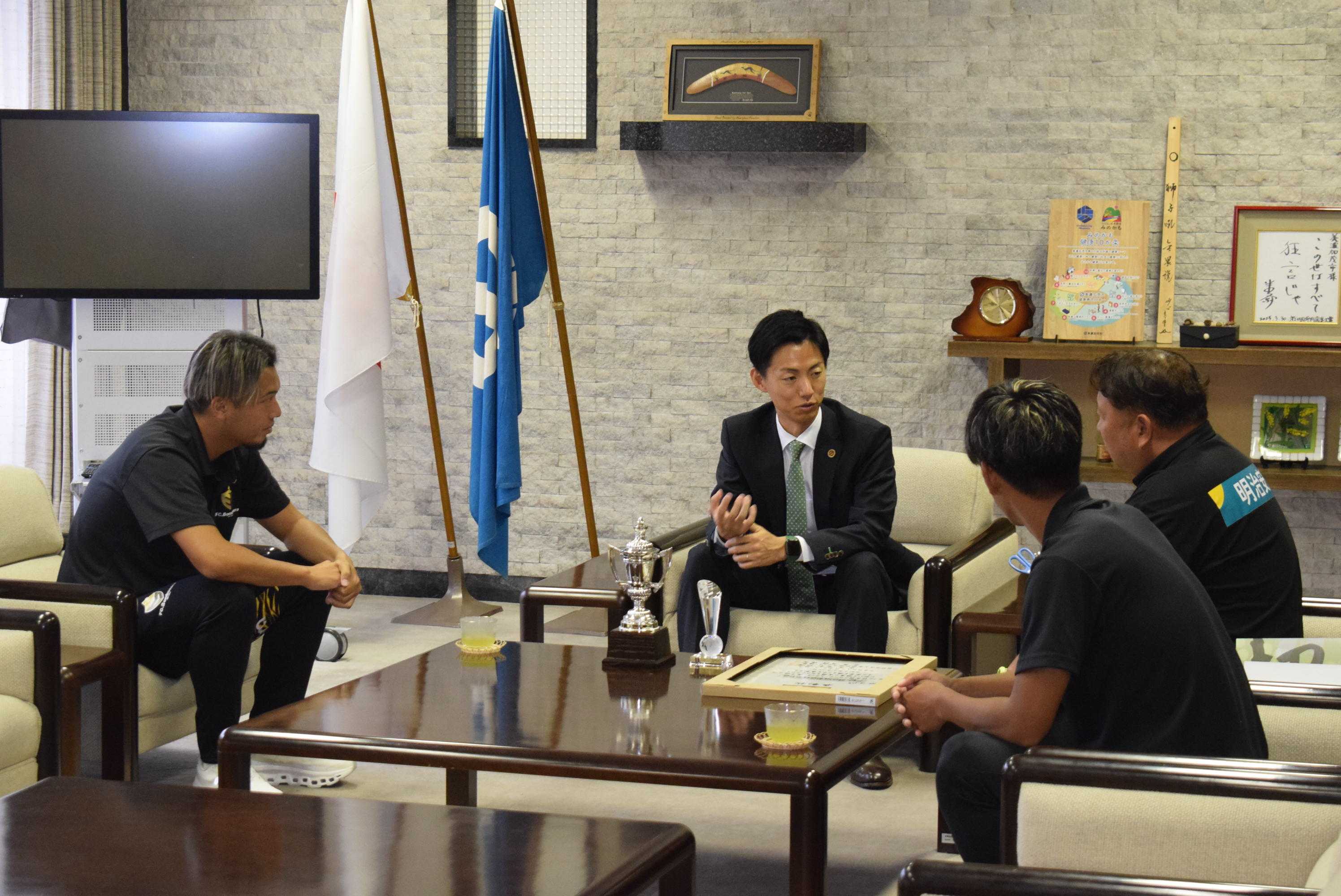 9月26日、美濃加茂市公室に、社会人サッカーチーム「FC.Bombonera」に所属している、三島拓(みしまたく)選手<キャプテン>と池田修志(いけだしゅうじ)選手<美濃加茂市在住>が、9月27日(土)~30日(火)に、福島県の「Jヴィレッジ」で開催された「全国クラブチームサッカー選手権大会」において、全国第3位になったことを報告するために、美濃加茂市長を表敬訪問されました。三島選手は、「昨年と同じ全国第3位という成績だった。今年はそれを超えるという目標で臨んだが、超えられなくて悔しい思いもある。しかし、私たちの目標は、リーグ昇格なので、気持ちを切り替えてこれからも頑張っていきたい。」と、感想を語られました。藤井市長は、「チームの活躍はメディアを通して拝見している。リーグ戦では大差で勝てるチームだが、全国大会のレベルになると僅差になる。2人の選手からは誠実さが伝わってくる。チームの雰囲気も良くなっているようだ。日本におけるスポーツの在り方はまだまだ途上にあると思う。皆さんのようなスポーツ選手が良い環境にあるとは言えない。スポーツ選手が社会の中で活躍できるような土壌を作っていきたい。スポーツをするだけでなく、社会の中での生き方も大切だと思う。ドイツでは、スポーツする人が多く、施設も充実している。日本ではまだまだである。スポーツ選手の皆さんとも力を合わせてそういう環境を作っていきたい。」と、祝福しました。