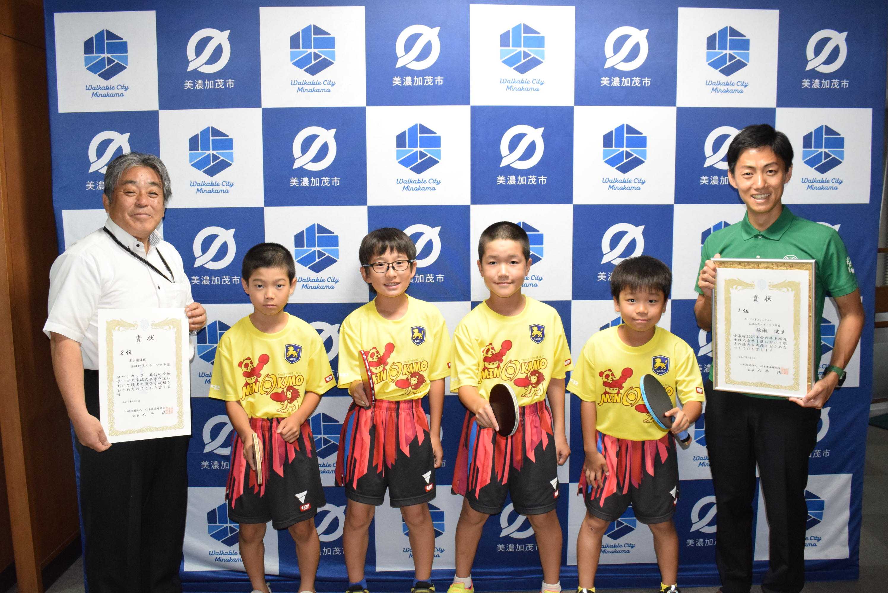 7月10日、美濃加茂市公室に、 「美濃加茂卓球スポーツ少年団」で活動している、太田小6年生の駒瀬健多(こませけんた)さん、山手小6年生の林航志郎(はやしこうしろう)さん、古井小5年の髙鶴友士(たかつるゆうと)さん、太田小4年生の林謙成(はやしあきなり)さんの4名の選手が、全国大会に出場することを報告するために、美濃加茂 市長を表敬訪問されました。