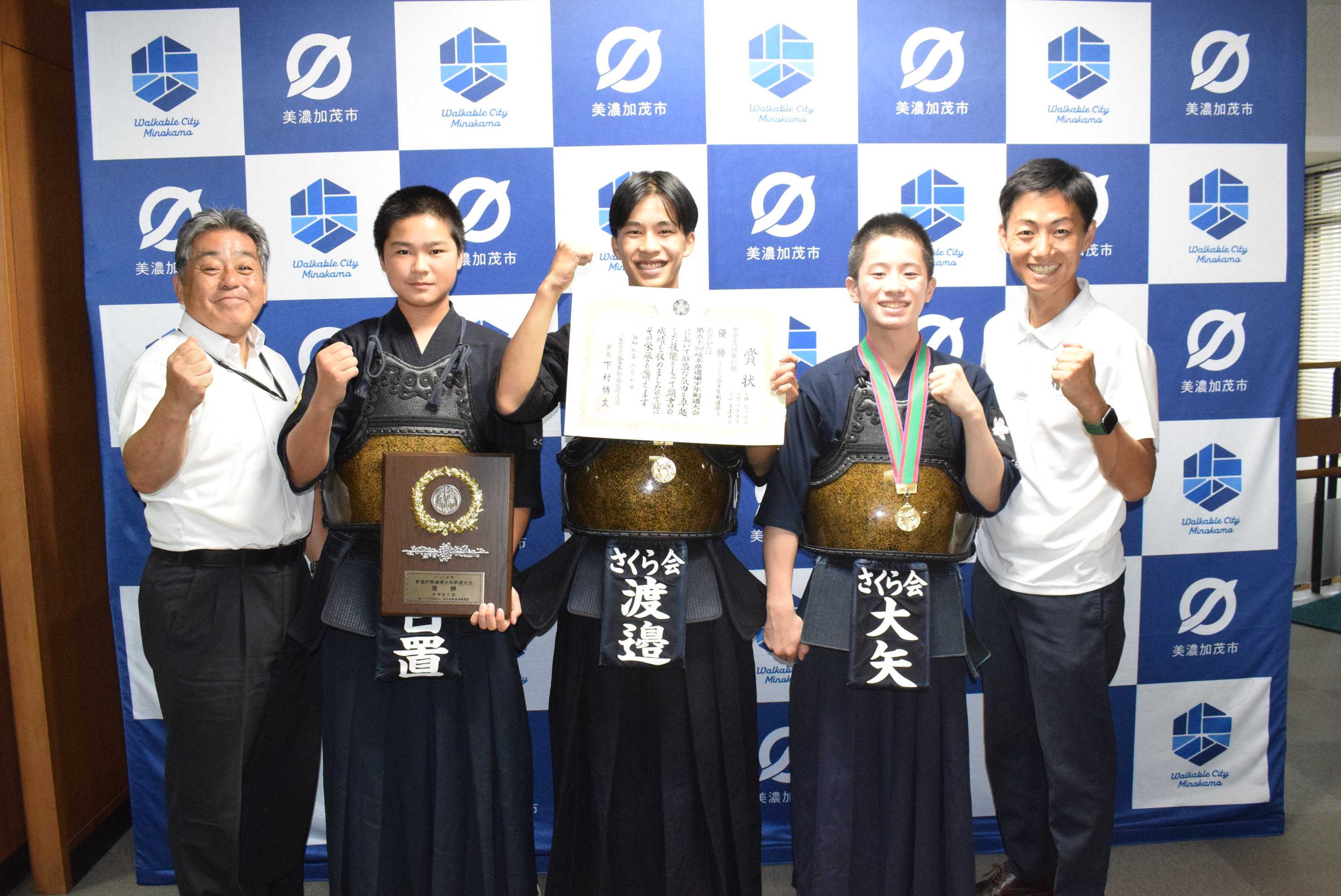 7月22日、美濃加茂市公室に、 「さくら会少年剣道部」で活動している、美濃加茂中学校3年生の渡邉稜平(わたなべりょうへい)さんと、2年生の大矢泰平(おおやたいへい)さん、東中学校3年生の日置駿光(ひおきとしみつ)さんが、全国大会に出場することを報告するために、美濃加茂 市長を表敬訪問されました。