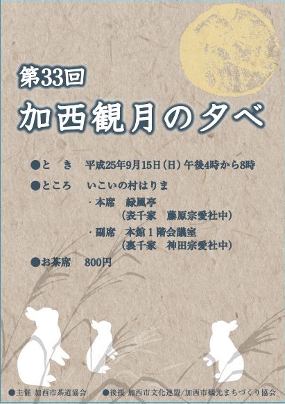みなさん、こんにちはさて、今週末情報いってみましょう9月15日(日)午後4時~8時いこいの村はりまにて、「第33回 加西観月の夕べ」が加西市茶道協会さんの主催で行われます本席 緑風亭(表千家 藤原宗愛社中)副席 本館1階会議室(裏千家 神田宗愛社中)1席400円是非、お越しくださいね