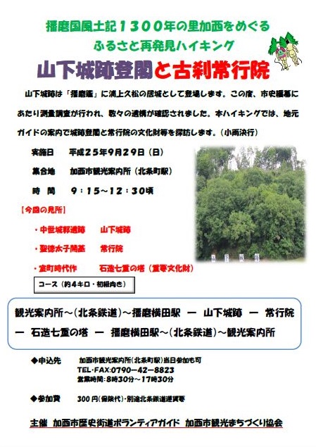 みなさん、こんにちは今週末は第3回グリーンパークトライアスロンin加西お天気も大丈夫そう、多分、きっと・・・そして、今日は当日行われます加西市歴史街道ボランティアガイド主催のふるさと再発見ハイキング「山下城跡登閣と古刹常行院」のご案内実施日:9月29日(日)集合場所:加西市観光案内所(北条町駅)時間:9:15~12:30頃北条町駅から播磨横田駅まで北条鉄道を利用し、そこからハイクします。参加費:300円(保険代)+運賃申込先:加西市観光案内所(0790-42-8823)当日参加もok山下城跡は「播磨鑑」に浦上久松の居城として登場します。この度、市史編纂にあたり測量調査が行われ、数々の遺構が確認されます。本ハイキングは地元ガイドの案内で、城跡登閣と常行院の文化財等を探訪します。(小雨決行)是非、ご参加くださいね