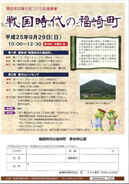みなさん、こんにちは本日はトライアスロン会場の旗立てを行ってきましたいいお天気になりそうでよかったです今日はお隣福崎町のハイキングのご案内加西市ゆかりの後藤又兵衛の出身である播州後藤氏の居城跡と言われる春日山城跡に上りますその前に、「北条の宿はくらんかい」での後藤又兵衛展でも講演いただく(福崎民話かたりべ研究会代表 鎌谷泉様)の講演会があります9月29日(日)10:00~11:20(受付9:30~)会場 春日ふれあい会館(福崎町八千種3718-1)ハイキング 11:30~12:30(少雨決行)春日山ふれあい会館~春日山山頂(春日山城跡)198m参加費 無料申込 福崎町観光協会にTEL、FAXしてください。TEL0790-22-0560 FAX0790-23-0687加西市にも多く残る播州後藤氏の起源を知るいい機会になると思いますので、是非ご参加くださいね私も行きたいのですが、トライアスロン大会があるので断念誰か代わりに行って、感想教えてくださ~い
