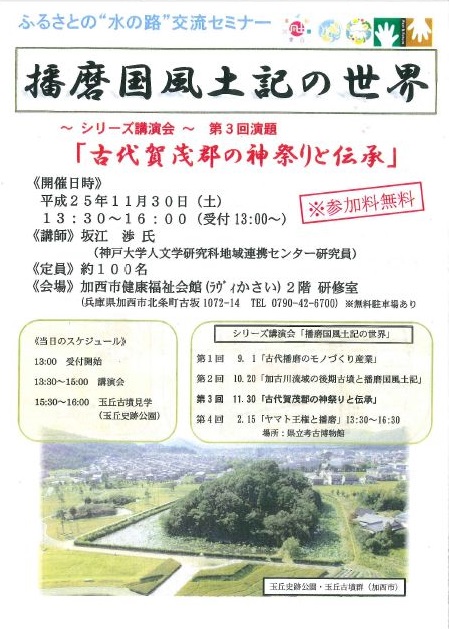 週末情報日時 平成25年11月30日(土)13:30~(受付13:00~)場所 加西市健康福祉会館(加西市北条町古坂1072-14)内容 (1)講演会(13:30~15:00)(2)玉丘古墳見学(15:30~16:00)申込締切 平成25年11月27日(水)お申込み&お問い合わせは東播磨流域文化協議会 0795-42-9081
