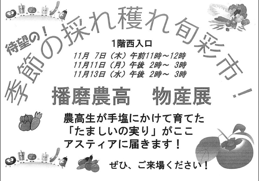 みなさん、こんにちはさて、本日のお得情報はこちら待望の季節の採れ穫れ旬彩市播磨農高物産展が、アスティアかさい1階西入口で定期的に行われます。11月7日(木)午前11時~12時11月11日(月)午後2時~3時11月13日(水)午後2時~3時播磨農高生が手塩にかけて育てた「たましいの実り」を是非ご購入ください