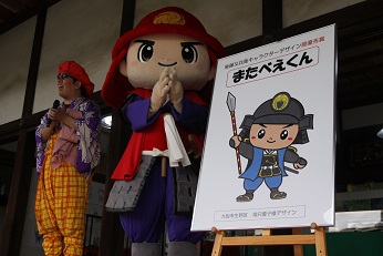 みなさん、こんにちは遅くなりましたが、9月中に加西市ゆかりの黒田官兵衛24騎のひとり、「後藤又兵衛」のキャラクターデザインを募集し、30点の応募の中、市民総選挙を勝ち抜き、選ばれた最優秀賞が、写真の「またべえくん」です作者は大阪市生野区の滝沢優子様の作品。10月26日にあった「北条の宿はくらんかい」内「後藤又兵衛展」にて、かんべえくんの除幕式で発表されましたかんべえくんも仲良しの部下ができてうれしそうでした今後はNHK大河ドラマ「軍師官兵衛」を加西市からも応援し、また後藤又兵衛ゆかりの地としてPRしていきますので、「またべえくん」ともどもよろしくお願いしま~す