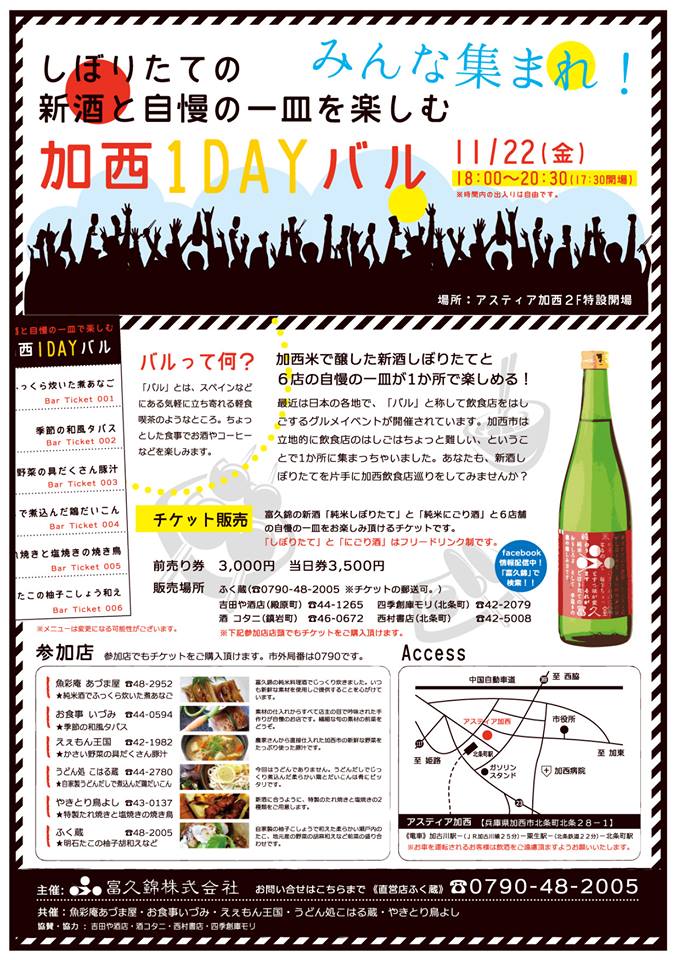 みなさん、こんばんはさて、夜も更けてきましたので、イベントのお知らせとうとう加西も「バル」やります富久錦さんの主催で、「加西1DAYバル」が開催11月22日(金)18:00~20:30(開場17:30)場所は、アスティア加西の2階加西米で醸した新酒しぼりたてと6店の自慢の一皿が1箇所で楽しめます。チケットは前売り3,000円、当日3,500円販売場所は、ふく蔵(0790-48-2005チケット郵送可・問合せ先)吉田や酒店(殿原町)、四季倉庫モリ(北条町)、酒コタニ(鎮岩町)、西村書店(北条町)です参加店は、あずま屋、割烹いづみ、えぇもん王国、こはる蔵、やきとり鳥よし、ふく蔵です。是非、加西の新酒と自慢の一皿を、加西初のバルで体感してください「バル」とは・・・スペインなどにある気軽に立ち寄れる軽食喫茶のようなところ。ちょっとした食事でお酒やコーヒーなどを楽しみます。日本では市内各地のお店が連携して行うのが流行っています。