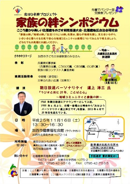 あの道上洋三さんが来られます11月16日(土)13:30~16:30「家族の絆シンポジウム」加西市健康福祉会館で行われます講演は、朝日放送パーソナリティの道上洋三さん「ラジオと共に37年、ことばと心」その他風土記の展示、宇仁や富田まちづくり協議会などの地域団体の特産品販売などがあります主催は、こころ豊かな美しい北播磨推進会議や県民局です。是非ご参加くださいね