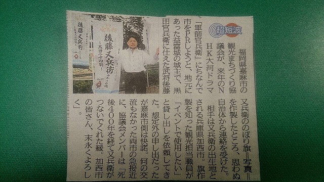 みなさん、おはようございます朝からいいニュースが届きました福岡を中心に発行されている西日本新聞の本日の朝刊の記事です「又兵衛がつないだ縁 兵庫・加西市に嘉麻市が協力」後藤又兵衛展を開催するにあたり、色々な自治体や団体、個人の方々にご協力をいただきました。その中のひとつが福岡県嘉麻市嘉麻市には、後藤又兵衛の居城「益富城」跡があります。ここで深いいはなしをひとつたまたま私の友人が嘉麻市役所にいまして、毎年益富城で行われる秀吉の一夜城祭りの写真を送ってきてくれたんです。そこになんと「後藤又兵衛ゆかりの地」ののぼり旗が写っているではありませんか「これや」もう又兵衛展まであと1週間ほどでしたが、すぐに観光担当の方を紹介していただき、そして快く貸していただきました。本当に嘉麻市観光まちづくり協議会、産業振興課の皆さまにはお世話になりました。今後も400年の時を経てつなぐご縁を「末永く」大切にしていきたいと思います