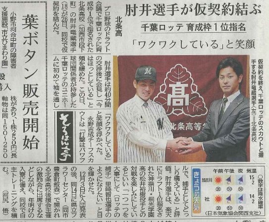 本日の神戸新聞に掲載されていました北条高校の肘井竜蔵選手が、26日、同校で、千葉ロッテ育成枠1位指名として仮契約を結びましたがんばって、一軍で活躍してほしいですねみなさん、応援しましょー