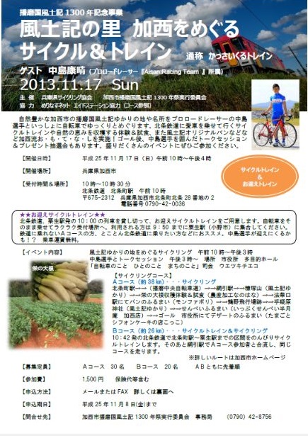 みなさん、こんにちはイベント目白押しの秋ですねさて、今日もイベントのご案内「風土記の里加西をめぐるサイクル&トレイン」11月17日(日)10:00~16:00受付時間・場所 10:00 北条町駅そしてゲストはあの中島康晴さん(プロロードレーサー)15:00からなかじーのトークセッションあり(市役所多目的ホール)募集定員はAコース(約38km)30名、Bコース(約26km)20名先着順参加費 1500円(保険代含む)申込方法 メールまたはFAXにて申込締切 11月8日(金)まで問合せ先 加西市播磨国風土記1300年祭実行委員会 事務局0790-42-8756なかじとともに加西の秋を感じましょう