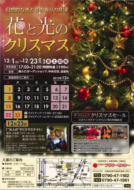 みなさん、こんにちはもう来週からは12月、師走ですね12月1日~12月23日の金・土・日・祝県立フラワーセンターでは、南入口ガーデンショップや中央花壇、温室内で、イルミネーションのライトアップやコンサートを行います金・土はライトアップを、日にはコンサートもあります。特別開園は、17:00~21:00(料金100円)是非、幻想的は光と花の香りの中、美しい音色に浸ってくださいね12月1日(日)から。