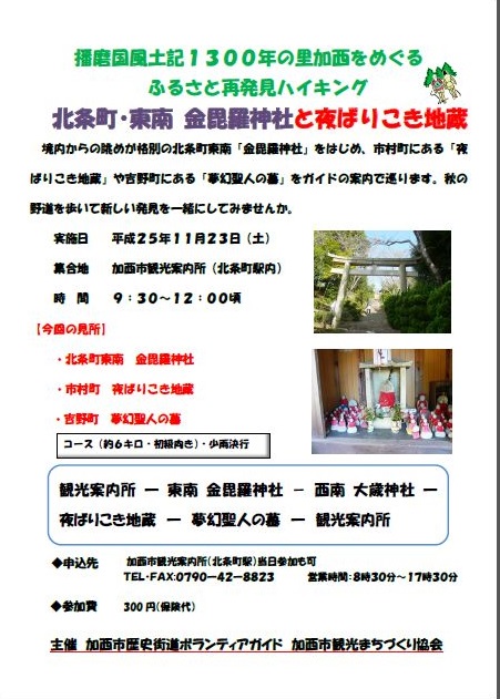 加西市歴史街道ボランティアガイド主催ふるさと再発見ハイキング「北条町東南 金毘羅神社と夜ばりこき地蔵」のご案内11月23日(土)9:30北条町駅集合 12:00頃まで参加費 300円(保険代含む)申込先 加西市観光案内所 0790-42-8823(当日参加もok)今月のボランティアガイドによるハイキングは、境内からの眺めが格別の北条町東南「金毘羅神社」をはじめ、市村町にある「夜ばりこき地蔵」や「吉野町にある「夢幻聖人の墓」を案内します野道を歩いて、新しい発見を一緒にしてみませんか