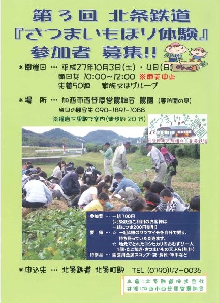 みなさん、こんにちは今日も秋らしいイベントのお知らせ~♪ 北条鉄道さんの『第3回 さつまいもほり体験』!!北条鉄道播磨下里駅から歩いて20分くらいにある加西市西笠原営農組合さんの農園において さつまいもほり体験が開催されます。おかずにも、おやつにも変身する『さつまいも』。 大好きです( 〃▽〃)1組4株のさつまいもを掘って~持ち帰りができます(*´ω`*)そして、地元でとれたコシヒカリのおむすび、たこ焼き、さつまいもの天ぷら~秋の味覚も楽しんでいただけます♪先着50組となっておりますので ご家族、お友達でご参加くださいね。開催日:10月3日(土)、4日(日) 10:00~12:00(雨天中止) 先着50組 場所:加西市西笠原営農組合 農園 (北条鉄道播磨下里駅から案内してもらえます)申込先:北条鉄道北条町駅 0790-42-0036