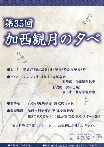 みなさん、こんにちは今日から、9月!!気持ち新たに、また頑張っていきましょうね。さて、今日は秋らしいイベントを紹介します(*´ω`*)『第35回 加西観月の夕べ』今年は、いこいの村はりま緑風亭(茶室)でのお茶席と中秋の名月を眺めながら~昨年は雨でできなかった野点(のだて)を芝生広場にて実施します。美味しいお茶と、お茶菓子をいただきながら日本の秋を楽しみませんか?( 〃▽〃)お茶席券、販売中です。☆販売場所:加西市観光案内所(北条町駅内) 加西市観光まちづくり協会(市文化・観光・スポーツ課)☆お茶席券:1席400円お気軽にお越しくださいね。
