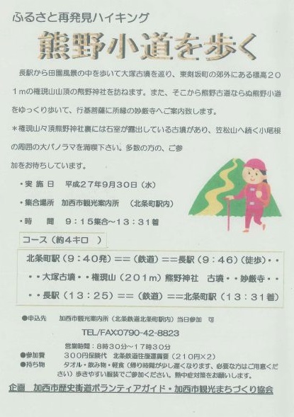 みなさん、こんにちは今日も涼しくて過ごしやすい1日でしたね。過ごしやすくなってきたこの時期~ハイキングのお知らせです(*´ω`*)ボランティアガイドさん主催の『ふるさと再発見ハイキング~熊野小道を歩く~』長駅から田園風景の中を歩いて大塚古墳を巡り東剣坂町の郊外にある201メートルの権現山山頂の熊野神社を訪ねます。そこから、熊野古道ならぬ熊野小道をゆっくり歩いて行基菩薩に所縁の妙厳寺へ案内していただきます(*´-`)約4キロのコース~。笠松山へ続く小尾根の周辺~大パノラマを楽しんでくださいヽ(*´∀`)人(´∀`*)ノたくさんのご参加お待ちしております。日時:9月30日(水) 9時15分 観光案内所集合 (9時40分発の北条鉄道に乗車します。 帰りは、13時13分北条駅着の予定です。)申込先:加西市観光案内所 0790-42-8823参加費:300円(保険代・北条鉄道往復運賃が210円×2)持ち物:タオル・飲み物・軽食(必要な方) 歩きやすい服装でご参加ください。