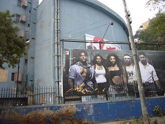 我が家のそばの「倉庫」のような映画館 (看板は「Dhoom 2」)映画館の中に入るには、身体検査と手荷物検査を受けなければなりません。まるで飛行機に搭乗するのといっしょです。お国柄、男女別々に行われます。そして、意外や意外!建物の中は外よりもずっときれいなんです\(◎o◎)/!設備は古いのですが、座席はリクライニングシートだし、館内にごみは落ちていなし、ホッと一安心です。ぐるっと見渡してみると、上映5分前だというのに半分くらいの人の入りです。満席だと聞いていたのにこれはどうしたことでしょうか?始まってからわかりました。そうなんです、インド人お得意の遅刻なんです。でも、人との約束には遅れても、映画には普通遅れてこないでしょう!?おかげで上映開始から30分間、何度も人の頭に画面を遮られてしまいました。日本人はわりと静かに映画を観ますよね。せいぜい笑い声をたてる程度だと思います。ところが、こちらの人たちのノリは想像を超えていました。まず、主役のHrithik Roshan(リティク・ローシャン)が登場する度に、大きな口笛と大歓声が巻き起こります。そして主役二人のキスシーンでは、なんとも表現のしようがない、うめき声ともため息ともとれるようなざわめきで館内は満たされたのでした…。というのも、インドではつい数年前まで映画の中でのキスシーンは御法度だったんです。解禁になったとはいえ、まだまだ少ないです。それが人気ナンバーワンの二人が初競演、しかもキスとなれば、インド人が大挙して映画館に押しかけないわけがありません。インド映画なので、台詞はヒンディー語です。英語の字幕はありません(インド国内での上映ですから)。でも、インド映画ってストーリーが単純明快なので、話の流れは理解できるんです。ただ、ところどころでみんなが笑っているのに私たちにはわからず、ちょっぴりくやしい思いをしました。