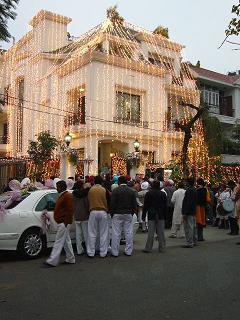 インドでは、夏の暑さが和らいでくる10月頃から結婚式のシーズンがスタートします。貧富の差が激しいこの国では、当然家によってお金のかけ方が違うとはいえ、花嫁側の親は莫大な費用をかけて娘を嫁がせなければならない習慣になっています。日本ではホテルや結婚式場で披露宴をされる方が多いと思いますが、インドはガーデン・パーティーが主流です。それは華やかですよ!写真をみなさんにもお見せしたかったのに、すみません、今、手元になくて… m(__)mその代わりといってはなんですが、自宅近くの豪邸で結婚式のセレモニーが行われていたので、そちらの写真を。 花嫁側の家では外壁を美しくライトアップして、娘の門出を祝います(富裕層のみ)。 新郎新婦が乗る車どうですか?みなさんのインドに対するイメージ、変わってきませんか?