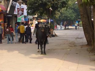 牛がとても怖いんです!インドでは約80パーセントにあたる人々がヒンドゥー教徒です。彼らは宗教上の理由から、牛肉を食べません。なんでも、牛はインドの神様の乗り物だそうで、非常に神聖視されています。そのため、インド中いたる所に牛がいるんです。道路はもとより、ショッピングエリアの敷地の中まで堂々と入り込んできます。 ニューデリーの「原宿」といわれている お洒落(?)なショッピングエリアを歩く牛普段は大人しいのに、時々、人や車めがけて突進するんです!!毎月のように牛による被害が新聞等で伝えられます(亡くなる人も…)。車のドライバーは人に対しては猛然とクラクションを鳴らしますが、道路の真ん中で寝そべっている牛には寛大で、ぶつからないように脇をそっと通り抜けています。牛肉が大好きな私…。牛たちに復讐されるんじゃないかと、町を歩くときはいつもビクビクしています (>_