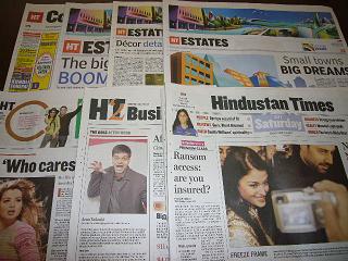 以前の記事にも書きましたが、インドでは英語が準公用語として広く使われています。そのため、教育を受けた人々の間では、英語で書かれた新聞や雑誌が、当たり前のように読まれています。英字新聞が各社から発行されていて、我が家は、夫用に経済新聞、マダム用に大衆紙、の2種類を毎朝配達してもらっています。経済新聞は、オレンジ色を帯びた用紙に黒のインク1色で刷られた、ごくシンプルな紙面です。一方、私が読んでいる「Hindustan Times」は、ほぼ全面がカラーで印刷されていて、それは派手な作りになっています。新聞が内容ごとに分かれて束になっています。この日は7つに分かれていました。 ● 一般のニュース ● 経済と世界のニュース ● ファッションと芸能関係 ● 商品等の案内と入札の広告 ○ 土地に関するニュースと広告(3部構成)上の4つは毎日入ってきて、あとは曜日ごとに違います(日曜日は結婚紹介が入ります)。ちなみに、この日の「一般のニュース」(上の写真の右下)の一面を飾ったのは、インドのトップ俳優同士の婚約を伝える記事でした。マダムのお気に入りは、もちろん「ファッションと芸能関係」ですね。ビーチリゾートにお薦めのファッションが特集されていました。(派手派手で、とても着られそうもありません (>_